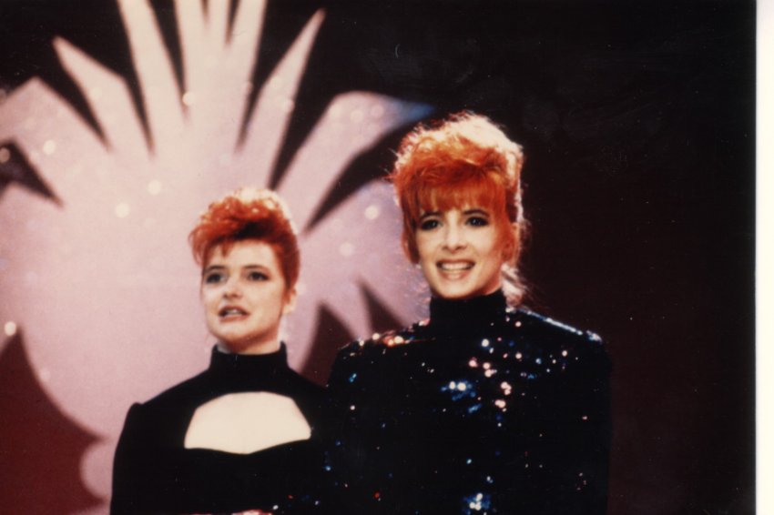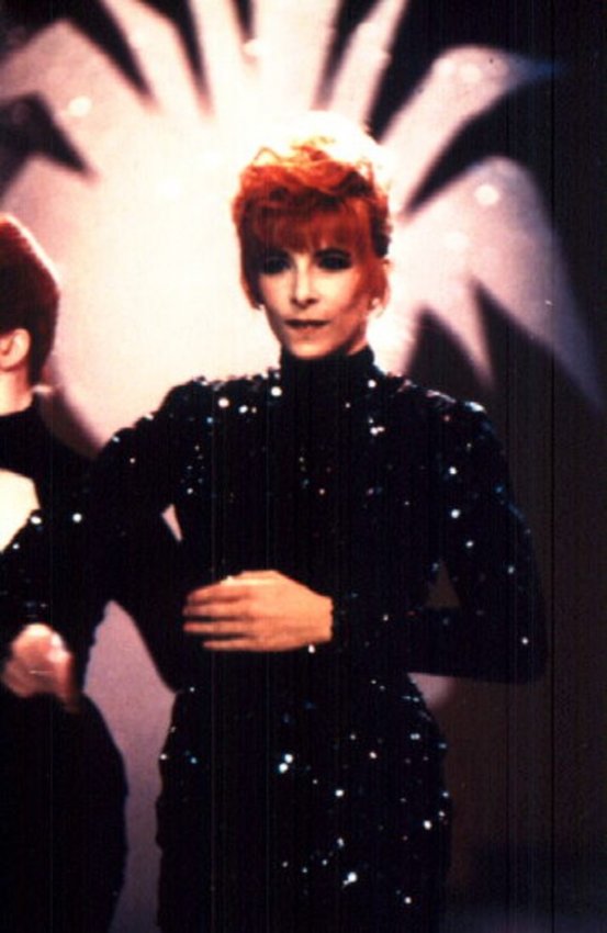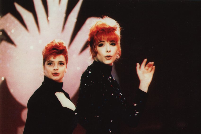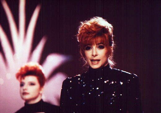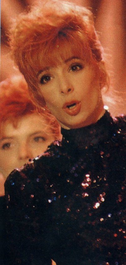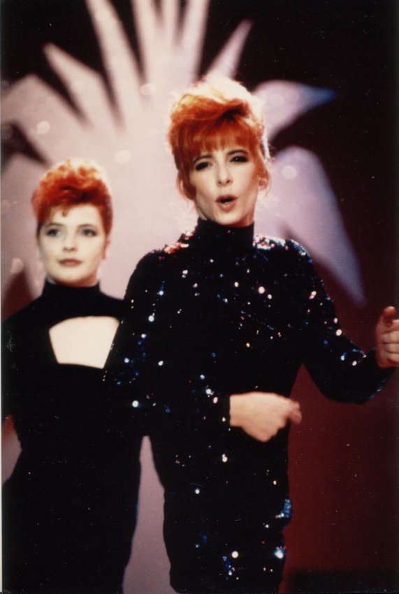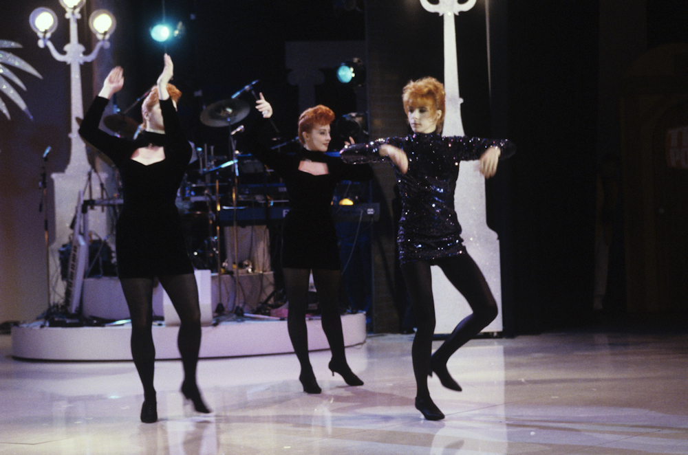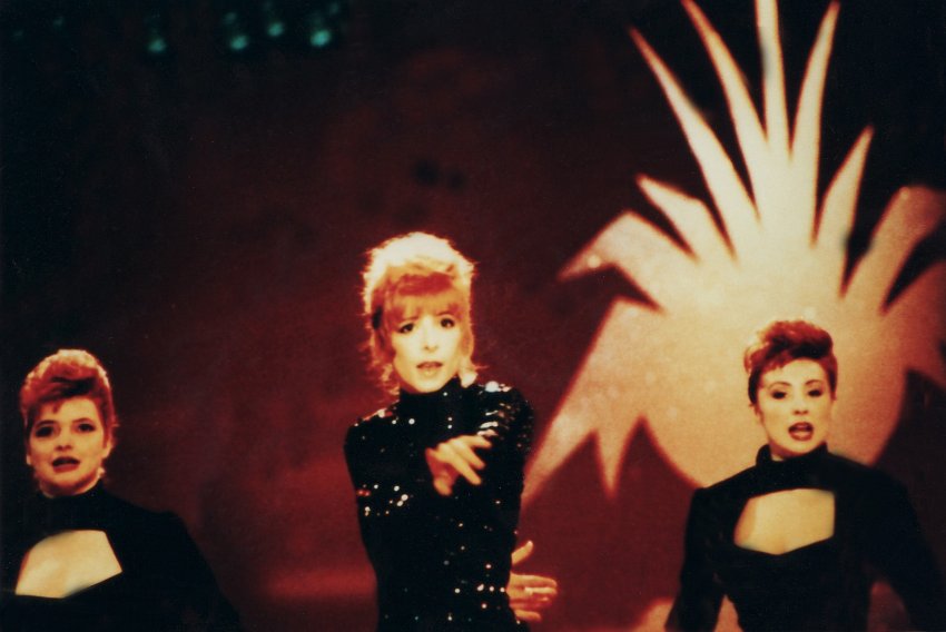 Mylène interprète Pourvu qu’elles soient douces accompagnée de ses deux danseuses Dominique Martinelli et Sophie Tellier.