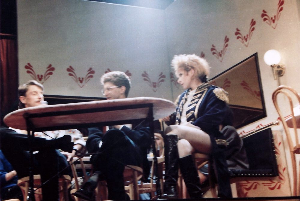 Elle répond à une interview aux côtés de l’animateur Philippe Luthers et du chanteur Francis Cabrel après avoir chanté Libertine.